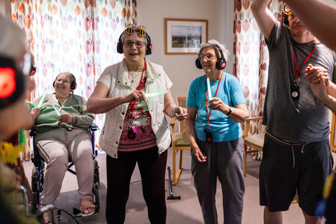 Here’s where we really shine! We’re all about bringing music, fun, and a bit of magic straight to care homes, turning ordinary days into something unforgettable. Our hosted silent discos aren’t just about tunes – they’re all about laughs, memories, and pure, feel-good vibes. Whether it’s a trip down memory lane with a bit of Elvis or a cheeky boogie to the classics, we know exactly how to keep the energy high and the smiles even bigger. It’s more than just a dance – it’s a moment that lifts spirits and gets everyone moving, all with a healthy dose of fun!